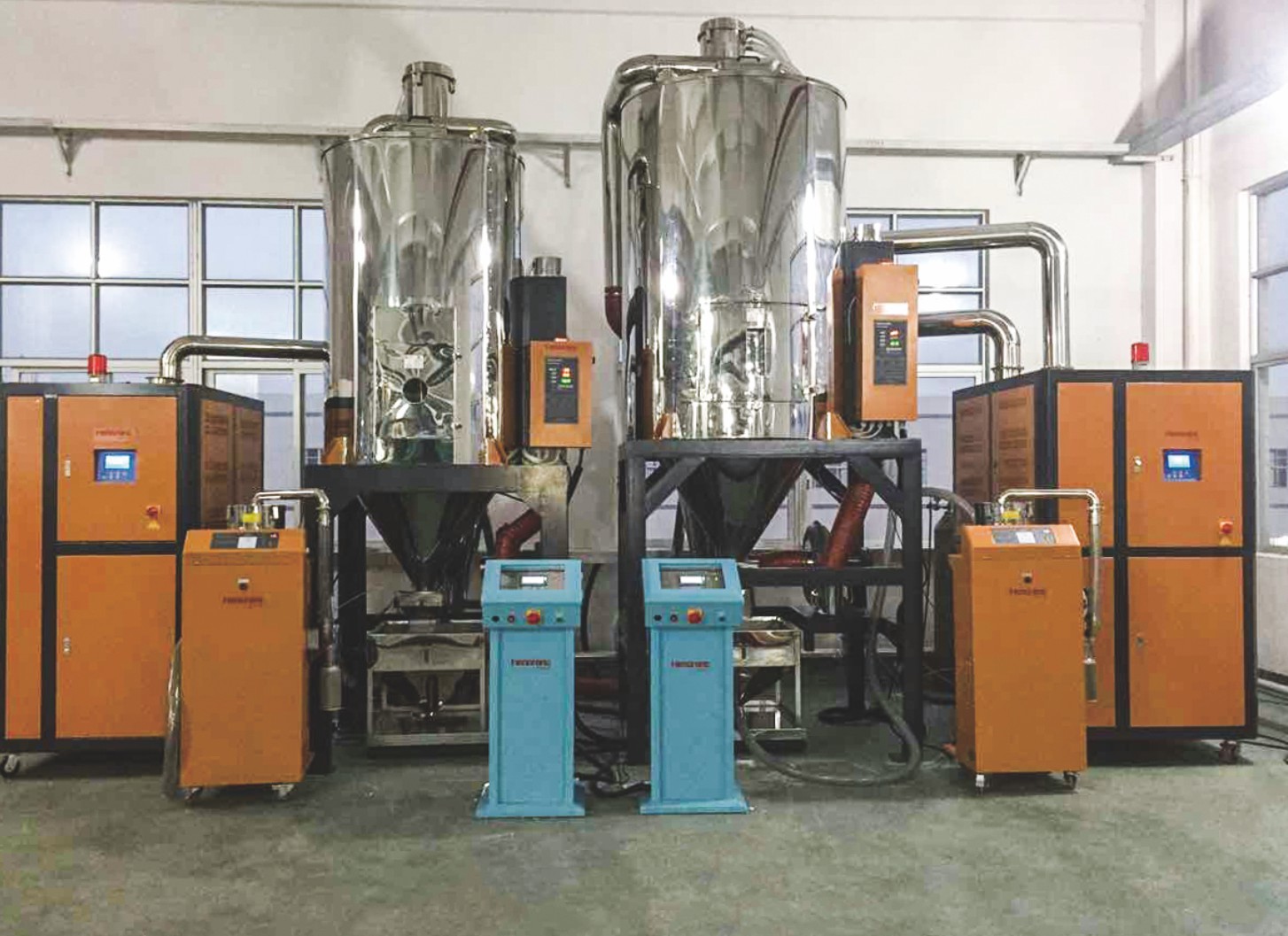 對(duì)于非吸濕性物料,可以使用熱風(fēng)干燥機(jī)進(jìn)行干燥。注塑機(jī)集中供料系統(tǒng)因?yàn)樗种皇潜晃锪吓c水的界面張力松散地約束,易于去除。此類機(jī)器的原理是,利用風(fēng)扇來吸收環(huán)境中的空氣并將其加熱到干燥特定物料所要求的溫度,被加熱后的空氣經(jīng)過干燥料斗,并通過對(duì)流的方式加熱物料以去除水分。